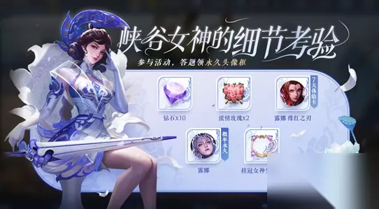 活动具体开启时间请关注官网公告 活动详情: 1)召唤师完成登录、对局、使用英雄-露娜参与对局,即可获得答题次数 2)累计答对题目可分别领取钻石*10、浓情玫瑰*2、露娜体验卡(7日)+露娜-绯红之刃体验卡(7日)、桂冠女神头像框等好礼;