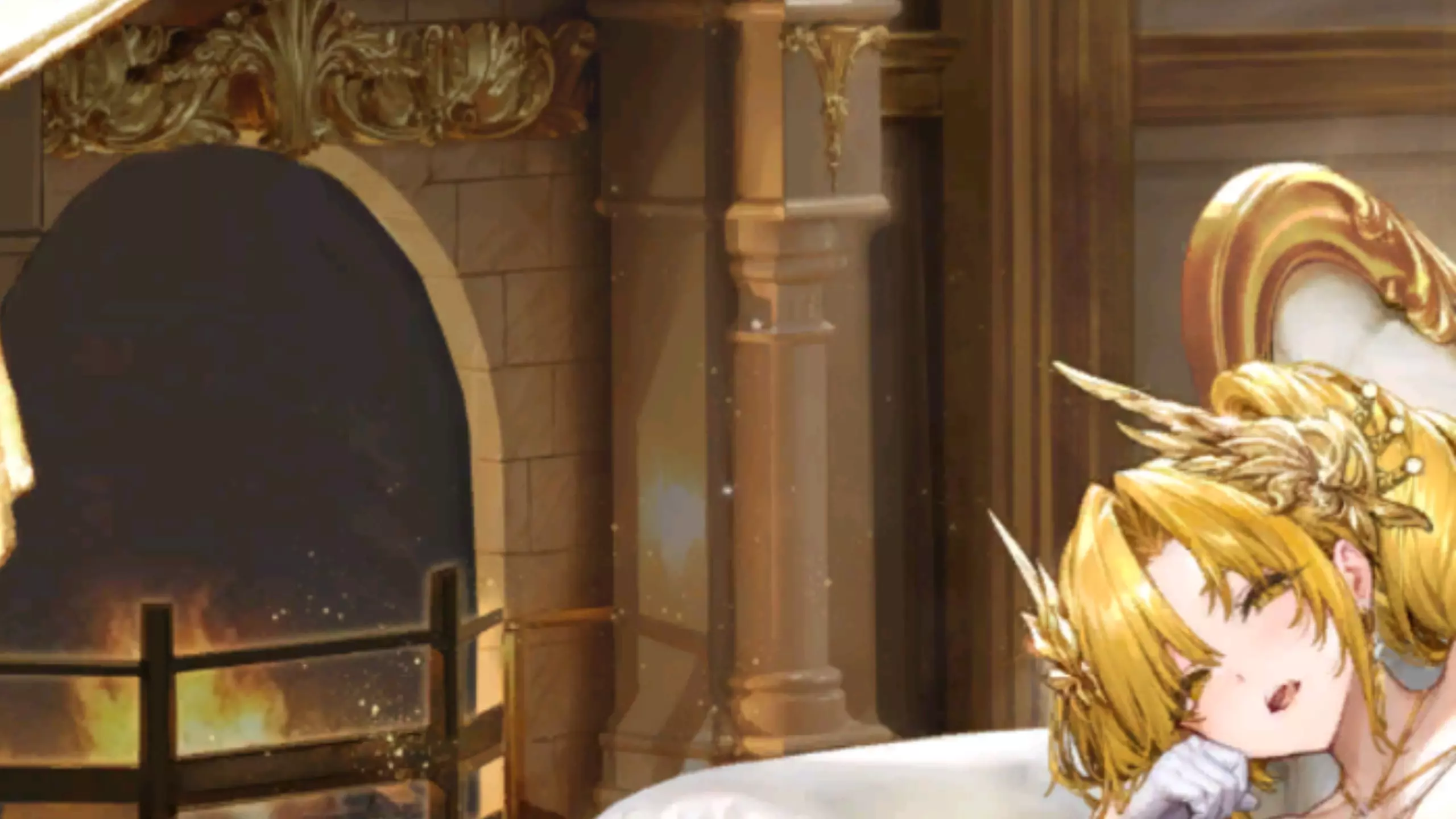 这是游戏《交错战线》二周年相关内容,展示了角色洛贝拉的“燃情热夜”主题形象,洛贝拉身着华丽金色服饰,在堆满金币的奢华房间内呈现出极具氛围感的互动场景。