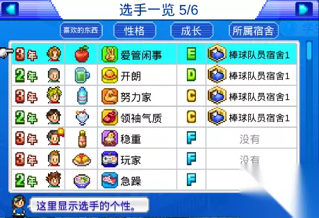 在比赛中,建议将队中较强的击球手放在3、4、5号位,这三个位置比较容易出现改写比分的机会。 球员成长很重要 善用相性特训快 在球员属性中,有一项球员成长看起来不起眼,但其实还是很重要的。成长按照S、A、B、C、D、E、F的顺序由高至低排列。这个属性代表升级时球员能够获得的属性点的多少,S最多F最低。虽然不管成长多少,球员都可以把属性训练到S级,但是成长高的球员所花费的时间精力要少很多,效率高。 特训是玩家需要经常使用的一项功能。其实搭配好参加特训的三名球员,可以更好的提升属性。这个搭配主要是看球员的性格,达成契合度要求后,三名球员会出现爆气。 以上就是小编带给大家的《棒球物语》的新手攻略。