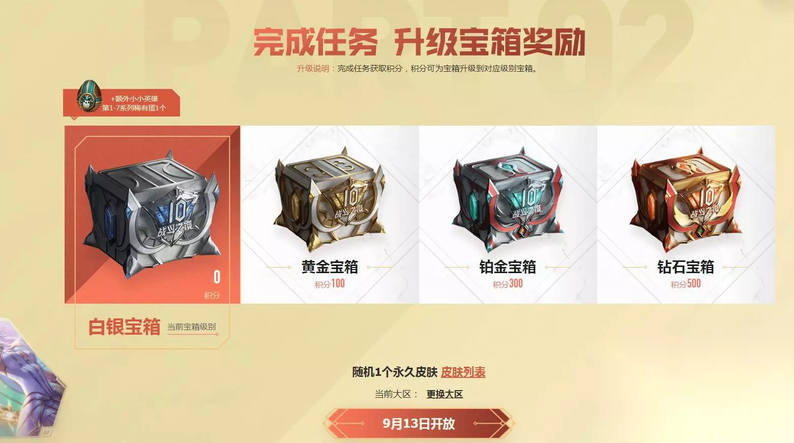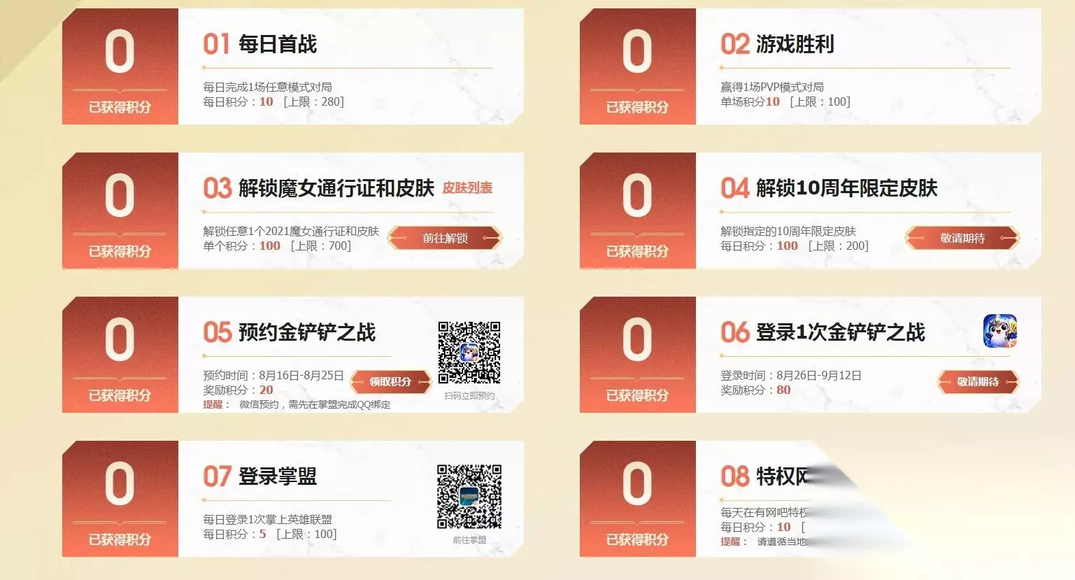 玩家解锁指定的10周年限定皮肤即可获得100点积分。通过完成该任务最多可获得200积分。 玩家在8月16日至8月25日期间通过扫描二维码预约金铲铲之战,即可获得20点积分。玩家用微信参与时,需先于掌盟预约页面完成QQ绑定。 玩家在8月26日至9月12日期间登录1次金铲铲之战,即可获得80点积分。 玩家每日登录1次掌上英雄联盟即可获得5点积分。通过完成该任务最多可获得100积分。 玩家每日在有网吧特权的电脑完成1场对局即可获得10点积分。通过完成该任务最多可获得30积分。因疫情防控要求,中、高风险地区用户请通过其他方式获取积分,避免线下聚集。