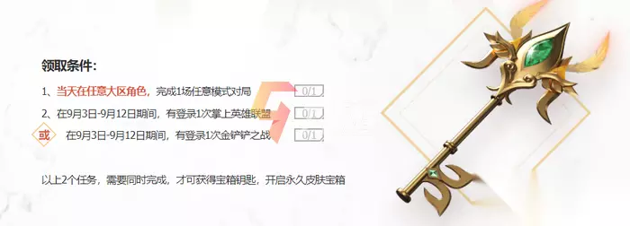 活动地址分享 我们前往英雄联盟游戏中,就可以在首页中找到【国服十周年庆典】的活动了,点击进入后,我们只要完成下面的条件,就可以领取自己的专属皮肤奖励了哦: 1、9月12日我们在任意大区完成一局战斗(自定义和训练营除外)。 2、在9月3日-9月12日期间,有登录1次掌上英雄联盟或者金铲铲之战。 以上任务需要全部完成才可以领取皮肤宝箱哦。