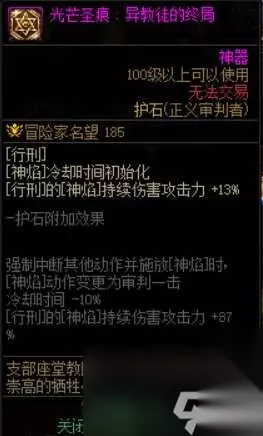 优点:聚怪,清怪非常好用,不带护石的时候可以位移,佩戴护石以后属于半脱手技能(前摇有点长),8w的秒伤数据也达到了及格标准。缺点:想要用神焰旋涡打输出必须要绑定护石,除了改变形态以外,28.3%的护石提升也还可以,但是对于团长而言,必带护石就意味着需要取舍和抉择,和他竞争的三个技能提升率更大,所以在追求伤害的层面显得有些许鸡肋。总结:神焰旋涡的秒伤中规中矩,佩戴护石以后依然如此,但提升率暂时还跟得上,属于带护石后可用技能,若不带护石,建议只加一级用来聚怪,对手感和输出环境有需求的话,可以考虑使用,需要注意的是,这个技能哪怕带了护石变成半脱手,也有明显的前摇,用净化之焰,也就是捏火,很可能把技能揉没。可以看出来,这三个技能各有优缺点,其中还有两个技能神焰怒火(40级技能,神焰旋涡(60级技能),基本上,如果想用就会绑定护石,难免会出现一定的冲突,而行刑的低秒伤,也让实战加点有了和100级版本不太一样的变化。当前版本新加入的“灵通”系列贴膜,鞋子的95冷却缩减自然不必多说,护肩对应的75级技能和40级技能恰好分别是团长秒伤和单次伤害最高的两个技能(计算护石后),也是护石秒伤提升率最高的,所以这让轮回斩加怒火的组合有了更大的舞台,同时也出现了新的问题,最后一个护石的选择,除了上面说到过的神焰旋涡(60级技能),还有一个不能忽视的技能,那就是35级技能... 更多关于 dnf正义审判 的内容,请查看本站相关系列文章,感谢您的支持与理解。