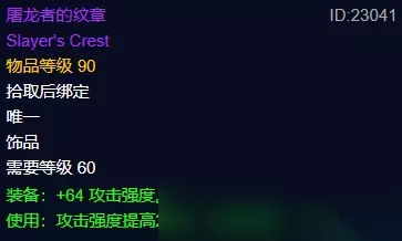 纳克萨玛斯中第二件近战毕业饰品是萨菲隆掉落的屠龙者的纹章,这件饰品同样是集被动和主动于一身的饰品,常驻攻强达到了64点,比龙牙饰物还高出了8点攻强,使用后可以提高260点攻强,持续20秒,这个饰品的强大之处不用解释了,在主动饰品方面应该是除了大地之击之外最高的,因此这件装备同样是近战职业真正意义上的毕业饰品。 十、大地之击