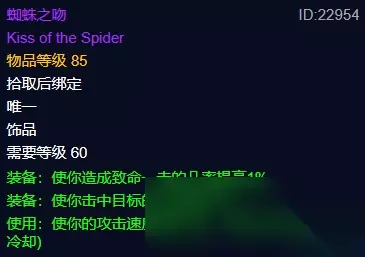 蜘蛛之吻是纳克萨玛斯副本BOSS迈克斯纳掉落的一件近战饰品,虽然蜘蛛之吻是一件主动类的饰品,但是却同样拥有常驻属性1%暴击和1%命中,这种属性无论是对狂暴战,还是对盗贼来说都是优先级非常高的属性。 当然蜘蛛之吻的强大之处还是主动开启后的效果,提升20%的攻击速度,持续15秒,2分钟冷却。众所周知,狂暴战和盗贼的白字输出占比都非常高,虽然持续时间仅有15秒,但是20%的攻击速度对于盗贼来说可以叠加切割的攻速加成,对于战士来说可以叠加乱舞的攻速加成,并且还可以大幅提升怒气获取。因此蜘蛛之吻这件饰品是非常有价值的。 九、屠龙者的纹章