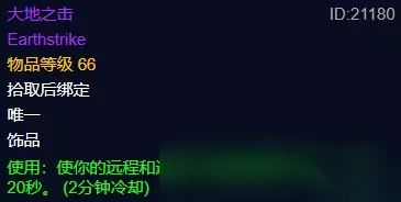 60年代最强大的爆发饰品非大地之击莫属,大地之击是一个主动饰品,使用可以增加近战和远程280点的攻强,持续时间是20秒,冷却时间却只有2分钟,在后面大部分BOSS战斗都可以使用2次以上。该视频并不是掉落的,是做任务获得,不过需要塞纳里奥会议声望达到崇拜。这可是要肝上一段时间的!