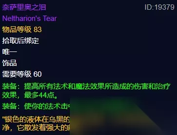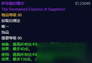 看完恢复宝石,能掩盖它光芒的也只有亡者之眼了。掉落于萨菲隆的亡者之眼是治疗公认最强爆发饰品。70点治疗效果加持输出稳定,而450点2分钟CD的爆发,更是救死扶伤的银色子弹。亡者之眼的稀缺程度也让它跻身于60巅峰之列。 四、萨菲隆的精华