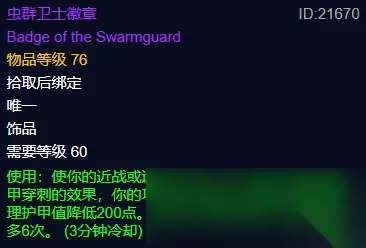 物理饰品,我们要讲的第一件就是奥妮克希亚龙牙。简单粗暴的2%命中提高,并且还不是只有命中,常驻的56攻击强度和1%的躲闪几率都异常香甜,盗贼、战士拿了根本换不下来。 七、虫群卫士徽章