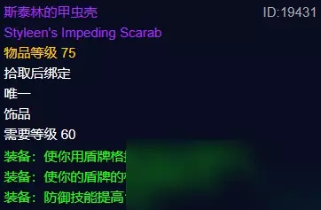 甲虫壳掉落于黑翼之巢的弗莱格尔,可以说是怀旧服60版本,MT心目中公认的最强饰品了,尽管其物品等级只有75,但斯泰林的甲虫壳加5%格挡几率,24点格挡值,外加13点防御技能,这样的绿字属性不仅齐全还给的很足,无论防等还是说盾牌格挡来说,就算拿到70级用,又有何不可? 二、恢复宝石