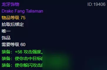 常驻2%的法术命中提高和44点的法伤提升,法系输出职业的梦幻饰品。在后期,命中溢出的可能性很低,所以2%命中的稳定性意义重大。因此就单凭这2%的命中几率提高也足以让玩家锁格子,后期配装轻松无忧。想成为一名高玩,奈泪无疑是必备的装备。 六、龙牙饰物