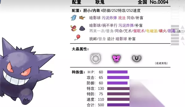 2、性格推荐选择内敛/胆小,这宝可梦不可能当盾的,太脆了只能全力去堆特攻速度,特性改了之后就很难打。 3、耿鬼的配招有两种,功能打法就是暗影球+污泥炸弹(可换诡计/其他特攻技能)+两个辅助技能(挑衅替身同命什么的都行)。