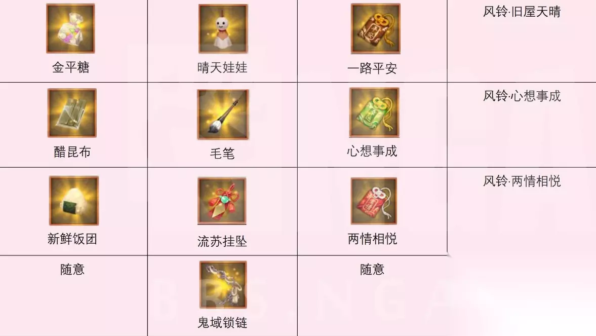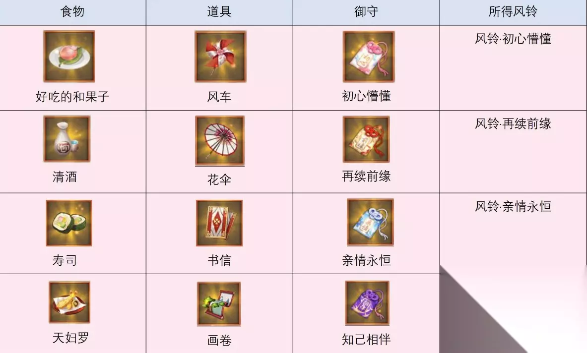 阴阳师缘结历练组合攻略大全 1.不同的食物、御守、道具搭配好之后派遣缘结神出去,4小时候归来会带回奖励。 2.正确的搭配会获得更好的奖励,并且带回需要收集的风铃。 3.所需的食物、御守、道具在缘结神社中使用祈愿币可以购买。