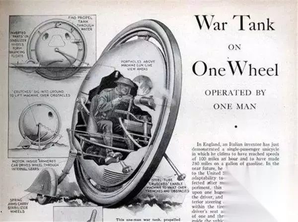 2.独轮坦克 这钟独轮坦克是上世纪30年代德国人的发明。它外观呈诡异的飞碟状,不过这个“飞碟”是竖起来的,轮子就是坦克(如果这也算坦克的话)本身,侧后方两个辅助轮负责保持行驶平衡。其实这种独轮坦克的概念早在第一次世界大战之前就已经有了,可见人们的想象力之丰富。只不过由于当时技术条件的限制,并没有生产出哪怕一辆样车。