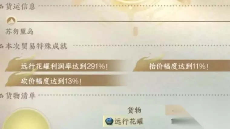 点开大地图显示灰色贸易战税率有55%的话就先别做了,等会儿再做不然就像我一样这周利润都很低 海舶令的利润是随机刷新的,我这周是高级海舶令25万+20万+15万,这周真的特别非 货品价格实时刷新的,也受砍价提价影响,所以有时候卖的会更高;订单利润有上限的,赚到订单需要的利润就行,溢出的利润系统也不会给你