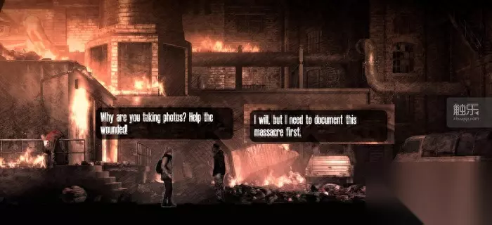 某场景中的女主忍不住问这个健全媒体人,为什么光拍照不救人,场面十分“白头盔” 这种欠妥的细节处理甚至部分影响到了剧情体验。比如为了突出Malik的信仰坚定,他常常强调事实的重要性,以及他对广播事业的重视,这些从故事叙述角度能理解——本意是为了铺垫剧情。这样一来,玩家(也就是他的妻子Esma)如果为了避免被军方追杀,选择欺骗Malik播送假消息,那么结局时,他会因为这种背叛离Esma而去。