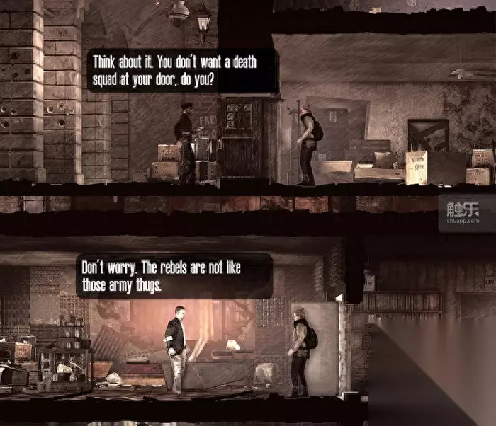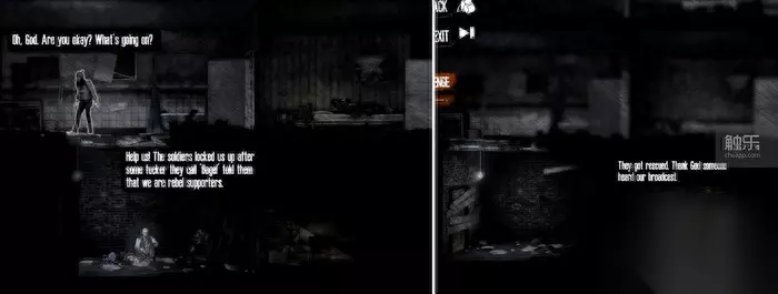 因为“发声”,军方对主角人身的威胁贯穿了剧情始终,叛军却有主角亲自站台 让人感到迷惑的是,如果《广播》真要彻底走向单纯立场,从娱乐角度倒也能让人接受,但由于故事的许多细节非常欠妥,使得玩家稍微动动脑子就觉得“味道很怪”,一边想举着“客观”的幌子声讨军方,一边又让角色做着各种毫不客观的强烈批判,有时你会觉得他们不是在歌颂自由,而是明粉实黑。 比如,故事中玩家会遇到一辆失联抛锚的军用物资卡车,里面有大量难民需要的食物,但司机仍在现场守卫。玩家可以选择将卡车的位置广播出去,那么这位忠于职守的士兵就会被人群殴致死。面对这样的结果,Malik会用“我们能救更多的人”这种说辞来回应妻子。 尤其是,这两位主角的孩子此时正在参军。出于剧情考虑,倒是没故意让这位司机设定为他们的儿子,但只要玩家有点同理心,依旧会意识到这位士兵肯定也是谁的儿子,难道他就活该如此死去?制作组也许可以用这种电车难题去考验玩家,但故事可以编得更圆一些——Malik的冷漠表现除了让人设崩塌,似乎达不成任何其他的目的,也无法引发客观上的思考。