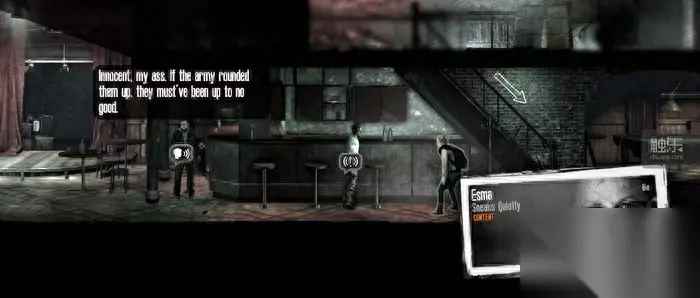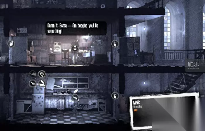 战争还在延续 厚道的创新 与仅能靠剧情撑脸的《父亲》相比,《广播》的大量创新绝对配得上“厚道”二字。 进入游戏后,玩家很快能接触到全新的角色属性——残疾。作为第二章女主角Esma的丈夫、广播的发声人,Malik是一位残疾人,他只能在家中行动,虽然能完成所有成年人的工作,但不能切换楼层,并且因拄拐行走而移动速度迟缓,当然也无法离家外出拾荒。 这个全新的属性丰富了《我战》原本的真实体验,让玩家感受到残疾人在战争中的无奈,在玩法上也添加了新意,显得比《父亲》和本篇角色里只是单纯开强悍挂的爸爸要有趣得多。 残疾完全不同于已有的其他“特长”类功能,而是参考了之前的另一个DLC《儿童》,在此基础上发展出的角色新定位,尤其是在游戏中,如果玩家不慎把灶台建设到Malik无法到达的楼层,那他连吃饭都需要妻子帮忙,也是显得相当“大龄儿童”了。