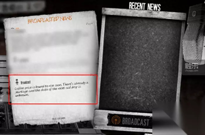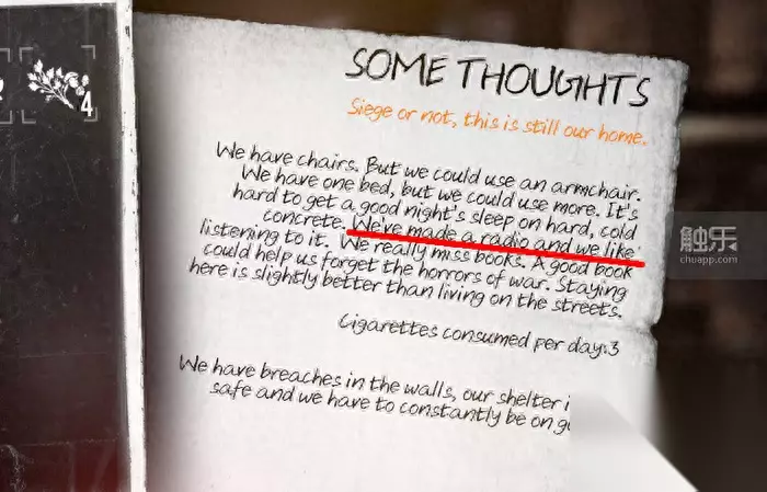 随机出现的自言自语,体现出他不喜欢骗人,自然也对谎言有极端的仇视 然而在玩家的体验中,这个效果很难达到。Esma全程都在照顾Malik,给吃给穿打理全家不说,还要冒死给Malik找新闻,不然连续两三天没新闻放,他就会沮丧闹脾气。从玩家角度看,Malik就像《冰汽时代》里那些刁民一样毫无道理,因而多少也达成了《冰汽时代》中的那种制作组可能并不想要的反效果——想让玩家感受军方之恶,却反而让亲身体验的玩家可能对之抱以同情。11 bit studios,你们当真不是反串,在暗黑广播人或残疾人吗?