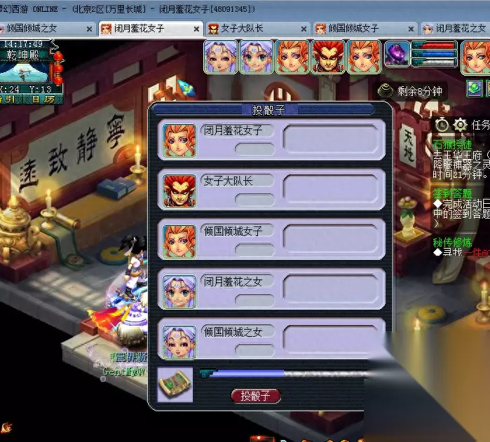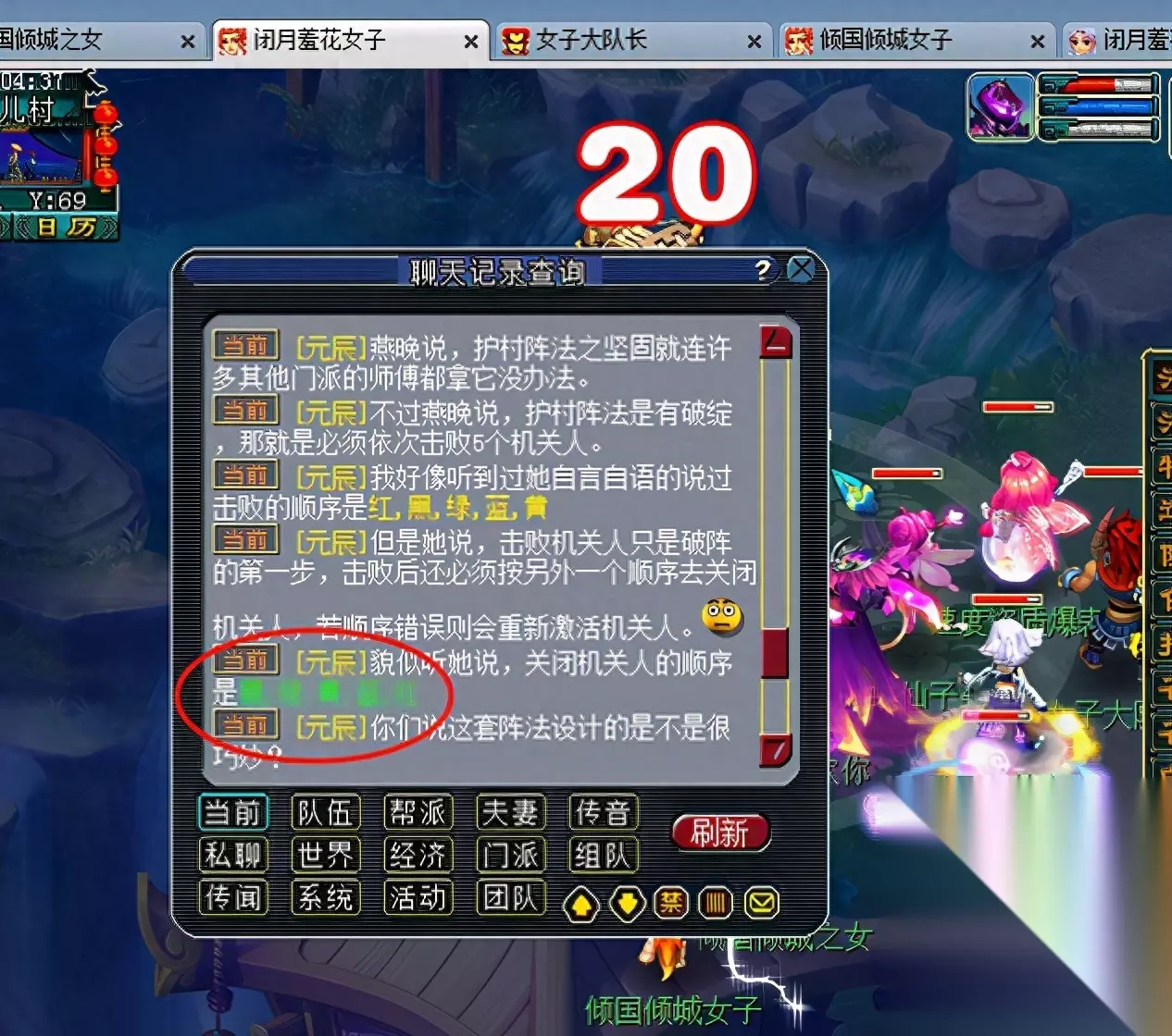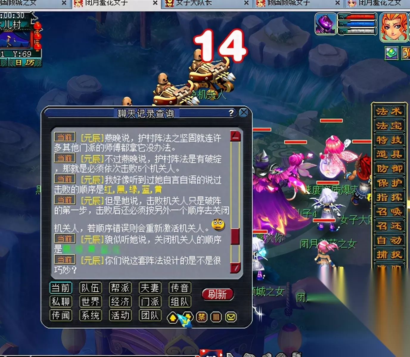 杀完之后跑着,是跑着 不能飞,也飞不动,只能跑着去女儿村。 进入战斗点开聊天框 打开当前 看到击败顺序 按顺序点杀,这个地方看清楚 有两个顺序,上面是击败 下面是关闭 按顺序击杀,每次只能杀飞一个,战斗没难度,怪物伤害不高