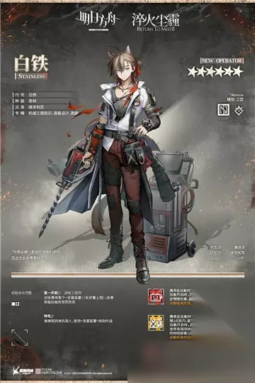 明日方舟白铁获得方法一览 一、人物简介 代号 白铁 种族 菲林 出身 维多利亚 专精 机械工程知识、装备设计、跑酷 中文CV:黄进泽 日文CV:寺岛拓笃 Illust:一千 二、获得攻略 淬火尘霾RETURN TO MIST 限时活动开启 —开启时间:10月11日16:00 —解锁条件:通关主题曲EP10【破碎日冕】10—19