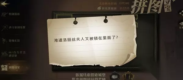 哈利波特魔法觉醒难道洛丽丝夫人又被锁在里面了位置分享: 10月6日也即今天,在哈利波特魔法觉醒中发布了新的拼图寻宝活动的线索:难道洛丽丝夫人又被锁在里面了? 这个线索应该对于熟悉哈利波特的原作的玩家会很简单,洛丽丝夫人是哈利波特中管理员费尔奇养的猫。而皮皮鬼曾经把洛丽丝夫人锁在盔甲里。