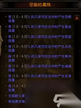 三分之一是等级降低,这不比上面镰刀的五分之一几率高多了? 同理,圣教军就不要洗连枷,改成洗双手剑,双手剑不是职业专属,就不会出现愤怒上限提高的属性。 还值得一提的是,这里之所以我能洗出来的属性这么少,是因为另一条次要属性是异常状态属性,武器的次要属性如果有一条是异常状态,那么另一条次要属性不会是异常状态,如果两条次要都没有异常状态的话,洗的时候干扰项就会很多: