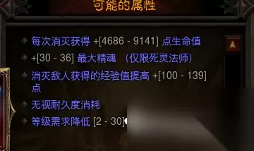 需要注意的是每洗一次花费金币都会提高一些,虽然暗黑三不缺金币,但是前期开荒还是省点,一个武器尽量不洗超过5次。 我们洗出来一个降得多一点的等级,比如洗出来等级需求降低26级,也就是70级的武器,只要44级就可以装备上,你的攻击会翻十多倍! 这里值得一提的是,我们尽量做一把非职业专属的武器,比如镰刀是死灵法师专属,连枷是圣教军专属武器,我们尽量不要做这种职业专属武器。 因为职业专属武器的副属性会有一条增加你的资源(如上面的镰刀加的精魄上限),会让你洗出来降装等的几率变低。 我同样用这个死灵法师做一个法杖的话,法杖不是职业专属武器,法师、巫医、死灵法师都可以用,那么我要洗副属性的时候,就不会出现加资源的那条: