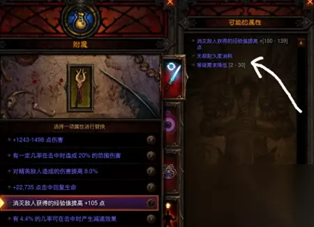此时把这把武器送到附魔师那里改变属性,注意是改变次要属性,也就是下面两条词缀,可以改变出“等级需求降低2-30级”的属性: