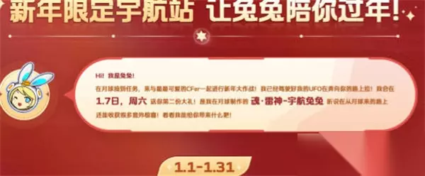 穿越火线2023年拜年口令码一览,穿越火线游戏中有很多的玩法,其中很多人在游戏中不知道拜年口令码最新的是什么,下面跟着小编一起来看看吧,希望此文章能帮到你。 1:活动是新春娃娃机,时间是在1月7日至1月31日,暗号宇航兔迎枪神,俱乐部拜年码是AG666; 2:我们打开活动地址,然后我们进入到新春娃娃机的页面中,如图所示;