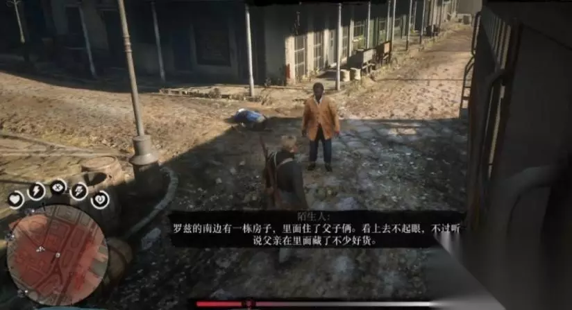 第二种情况玩家在路上遇到单独的犯人在逃,有两种处理方法。一种是用枪射开犯人脚链,犯人会告诉玩家一些秘密,比如给玩家说罗兹镇南边房子里面的父子俩藏了不少好货,或者说草莓镇有个老妇人藏了笔钱,玩家得知后是可以前往该地区进行抢劫的,有可能会获得金钱或者一些枪械道具。