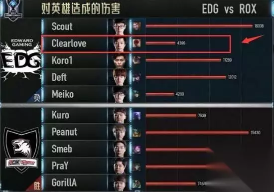 在EDG对战的ROX的其中一局比赛中,厂长选择了瞎子,最后比赛结束的输出是4396,数据显示,厂长的瞎子伤害仅比辅助娜美的伤害高100,输出不到对方打野三分之一。