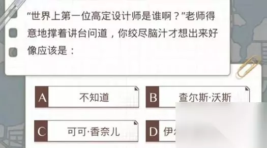 1、以下哪个服装不属于汉服? 答案:C马褂(其他选项深衣、衣裳、马面裙都是) 2、谁是世界上第一位高级定制设计师? 答案:查尔斯·沃斯(A不知道,B查尔斯·沃斯,C可可香奈儿,D伊尔莎) 3、羊毛布料有哪个优点? 答案:保暖性好 4、“himation”指的是什么? 答案:古希腊人的服装名称 5、为什么1951年玛丽莲·梦露的公司让她穿上装土豆的袋子拍照? 答案:为了证明她穿任何衣服都有魅力。 6、风衣是参考了哪种服装设计出来的? 答案:雨衣 7、风衣的起源是什么? 答案:第一次世界大战期间的军用大衣。 8、衣服吊牌上附带的布料是用来干什么的? 答案:用来测试水洗的效果。 9、在家中保管珠宝的实用方法是什么? 答案:将其放在真空塑料袋中。