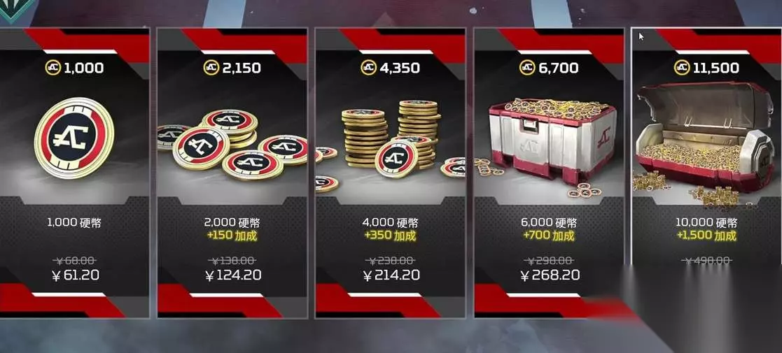 Apex英雄金币充值价格是怎样的?金币是用于购买补给箱以及商城皮肤的货币,需要通过氪金充值来获取,下面为大家介绍一下游戏官方充值金币的售价,想要了解的玩家可以参考以下攻略介绍。 Apex英雄金币充值价格一览2023 游戏内直充价格如下: 68元=1000金币; 138元=2150金币; 238元=4350金币; 298元=6700金币; 498元=11500金币;