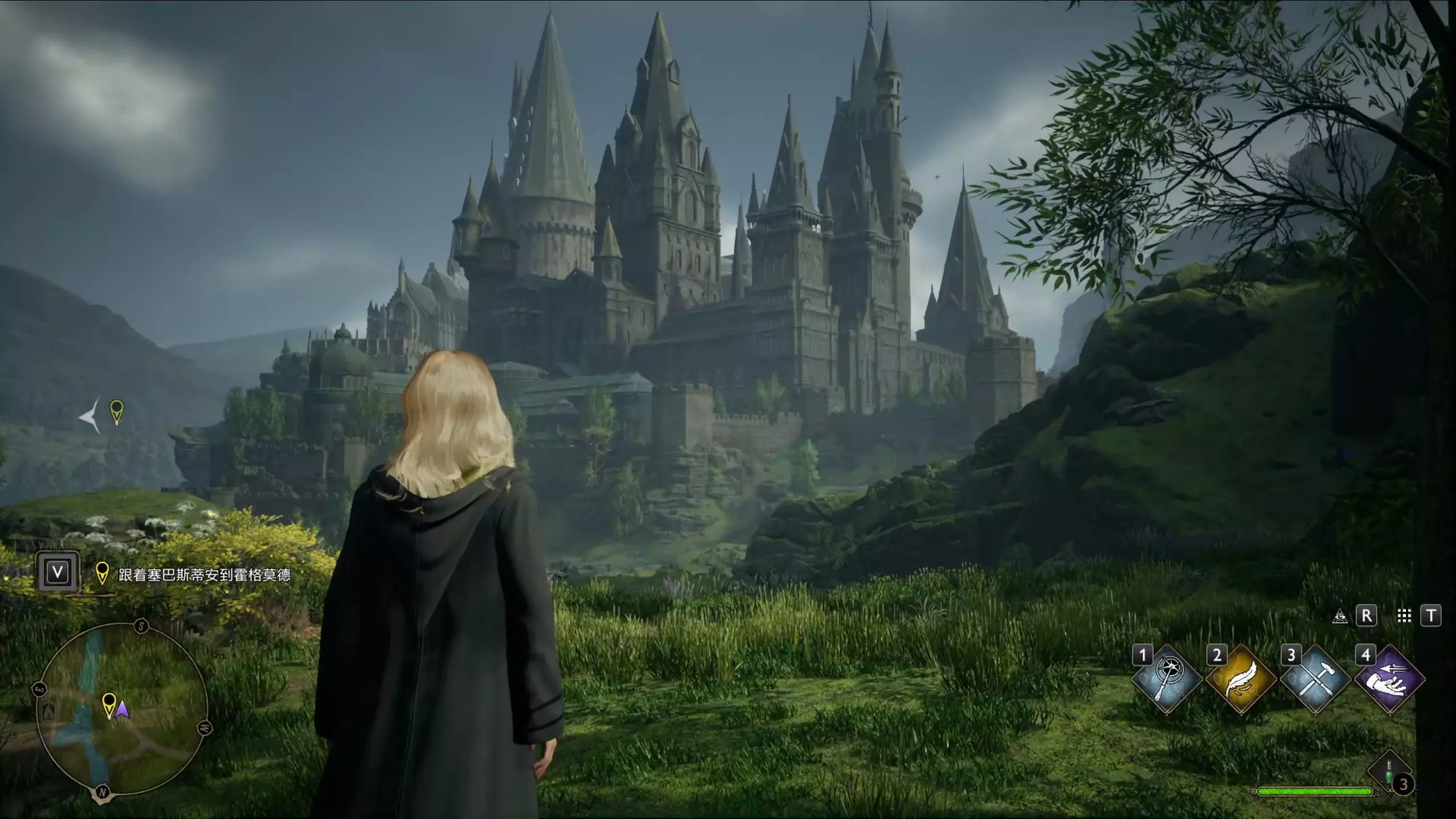 这是单机游戏《霍格沃茨之遗》的游玩内容,玩家操控角色在霍格莫德对战装甲巨怪,刚学会魔法的玩家只能胡乱按键释放魔法,完成保卫霍格莫德的任务。