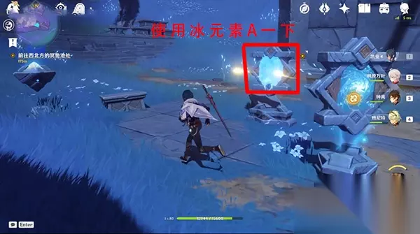 二、三界路飨祭·其一 1、完成【三界路飨祭·前夜】之后获取到【三界路飨祭·其一】的任务线索,然后跟随任务指引往西北的冥鱼池,在这里会遇到一个机关需要完成解密; 2、使用冰元素角色对第二个机关攻击一下,然后调整第一个机关,解密完成之后使用【睦疏之匣】来引路;
