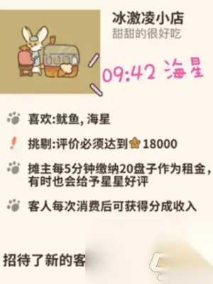 动物餐厅冰淇淋摊主解锁攻略分享 解锁要求:顾客评价18000星以上 店铺租金:每5分钟缴纳20盘子