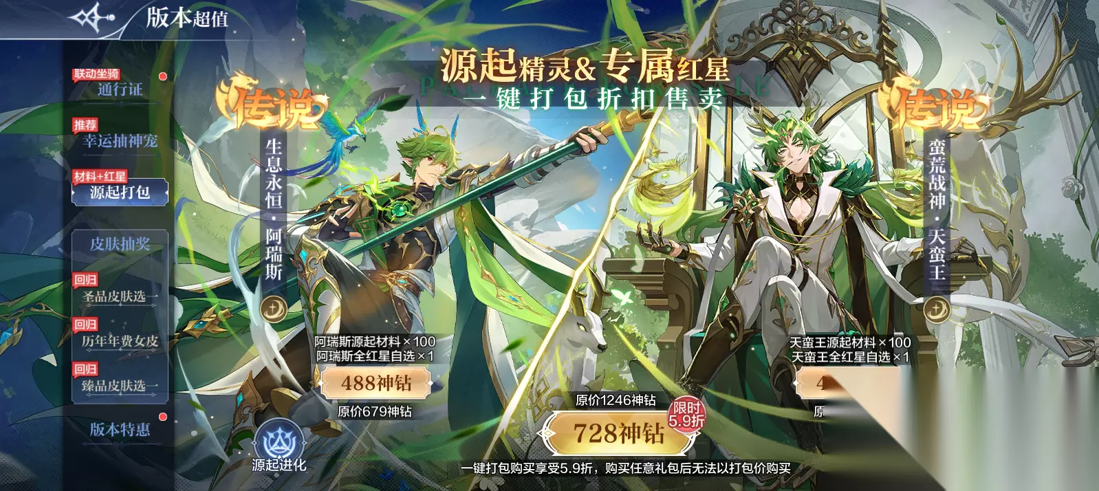27.【通行证】最新联动坐骑/双人坐骑登场 活动时间:1月16日5:00-2月13日5:00 ●免费档:坐骑/潜能药水自选宝箱【新增联动坐骑:炎龙驹】、坐骑币、橙色收藏品自选箱、良品修复液等 ●18元付费档奖励升级:红色灵纹自选宝箱*3、灵纹经验*100万、钻石*3150、神器币*600 ●30元付费档10倍超值:通行证坐骑自选箱【新增双人坐骑:光之帝皇战龙、联动坐骑:炎龙驹】、潜能药水*10000、钻石*5250、神器币*1200 ●40元付费档10倍超值:皮肤自选箱、潜能药水*10000、皮肤币*100、钻石*5250、神器币*1200 注:双人坐骑仅可邀请同服在线好友骑乘 ※联动坐骑下架时间: ●联动系列坐骑在2026年3月20日更新前均可在通行证获得,3月20日更新后,通行证领取的箱子不再包含联动坐骑 ●已获得的联动坐骑自选箱不受影响 28.【铠甲勇士】联动时装限时售卖 活动时间:1月16日5:00-3月20日5:00 ●服饰套装【炎龙侠】、炎龙侠联动手持【烈焰弓】 ●服饰套装【帝皇侠】、帝皇侠联动手持【帝皇战戟】 29.【幸运抽神宠】最新神宠限时超值抽 活动时间:1月16日5:00-2月13日5:00 限时抽取:盈沃生息·盖西瑞、繁森锐意·阿瑞斯、铠甲勇士·炎龙侠、蛮荒战神·天蛮王(1.23开启)、亘古年轮·永恒龙尊(1.30开启)、颂林仙谣·卡雅(1.30开启) 1、惊喜版:(首次购买额外赠送体力*120) 有6次机会分别在对应奖池抽取大奖、每次保底必得神钻*10、抽中大奖直接获得该奖励! 2、尊享版:(首次购买额外赠送神唤券*10) 有6次机会分别在对应奖池抽取大奖、每次保底必得神钻*30、抽中大奖直接获得该奖励! 30.【超值打包】天蛮王阿瑞斯源起材料&专属红星组合特惠 活动时间:1月16日5:00-2月13日5:00 ●限时打包(原价1246神钻,5.9折特惠728神钻):阿瑞斯源起材料*100、源起阿瑞斯全红星自选*1、天蛮王源起材料*100、源起天蛮王全红星自选*1 ●阿瑞斯礼包(原价679神钻,7.2折特惠488神钻):阿瑞斯源起材料*100、源起阿瑞斯全红星自选*1 ●天蛮王礼包(原价567神钻,7.2折特惠408神钻):天蛮王源起材料*100、源起天蛮王全红星自选*1 注:若购买阿瑞斯或天蛮王单人礼包其中之一,后续无法购买打包礼包。