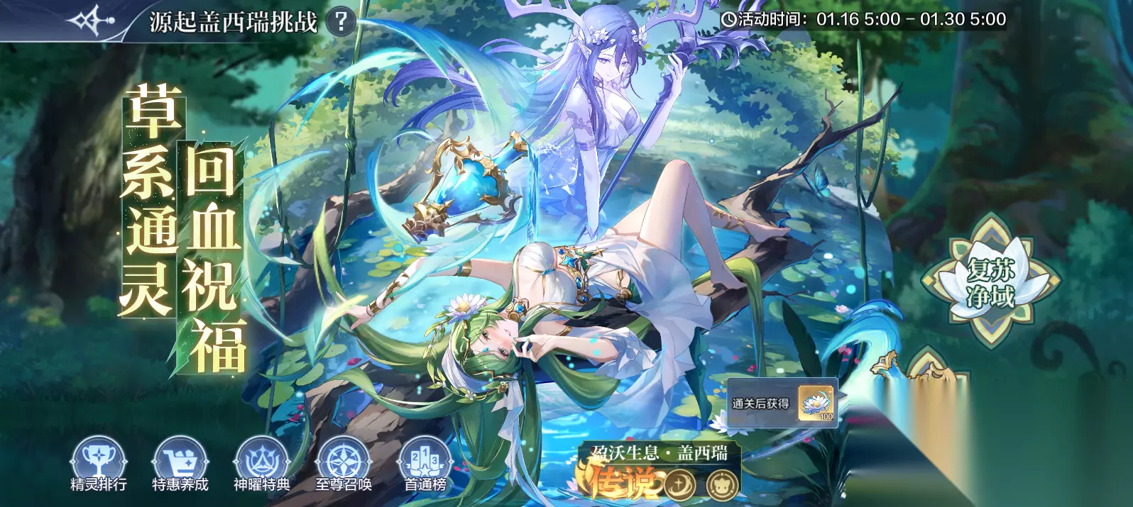 5.【盈沃生息】挑战得盖西瑞源起材料*100(最快1天) 活动时间:1月16日5:00-1月30日5:00 挑战规则:共有2个挑战,分别为【复苏净域】、【生命之树】 ※【复苏净域】挑战(可得限时至尊券*20): 1、每日5:00刷新三个关卡,使用自己的精灵,系统属性进行战斗; 2、破阵后可重复挑,战记录每个关卡今日己阵的最高的复活次数; 3、活动期间累计复活次数达标可领取进度奖励。 ※【生命之树】挑战(可得源起材料*100) 1、战斗中,己方精灵每复活1次,将给生命之树增加1点能量; 2、己方存活3个大回合或击杀敌阵即为挑战成功,记录本关获得的能量; 3、所有挑战成功,且所有关卡累计生命之树能量达标即为通过本挑战,获得挑战奖励; 4、战斗中,根据当前累计的总能量,激活不同的战斗加成; 5、挑战成功后,将封印本战斗复活次数最多的精灵,后续挑战不可继续上阵; 6、敌阵具体效果可在挑战界面查看。