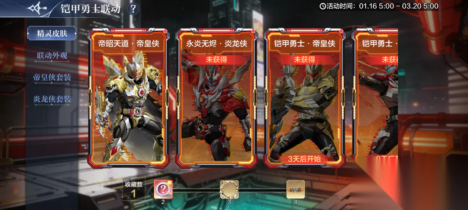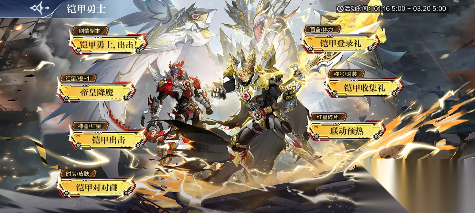 9.【铠甲勇士】铠甲出击,斩破黑暗!得炎龙侠神器&专属红星 活动时间:1月16日5:00-3月20日5:00 活动奖励:炎龙侠神器2选1*4、炎龙侠专属弑戮无赦红星*1、随机宠物宝箱*10、宠物品质药水*30000、随机红色灵纹*10、灵纹经验*100万、金币*100万、铠甲盲盒(用于铠甲对对碰活动抽取奖励) 活动内容: 1、恶灵身上有不同星级,星级越高的战力越高 2、可以选择任意恶灵进行挑战,挑战完毕后根据击杀伤害发放伤害奖励;若恶灵被玩家自己击败将额外获得击杀奖励; 3、未击败的恶灵受到攻击后,地图中的所有恶灵都将前进一格。为了保护好主城,冒险家们可以将未击败的恶灵分享给好友帮助击杀;好友帮助击杀未击败时,恶灵是不会前进的哦~ 4、好友求助没有次数限制,但是必须要自己挑战过恶灵后才可进行分享。好友帮助击杀后,好友会获得对应的伤害奖励; 5、每次挑战恶灵氛围普通击杀以及强力协助,普通击杀将消耗疲劳值,强力协助需要消耗更多的疲劳值并且会获得额外的伤害效果; 6、主城血量为0或所有恶灵被击败后,将会刷新地图进入下一关卡; 7、打不过的关卡也可进行手动刷新,每日有10次刷新次数,次日重置刷新次数; 10.【铠甲勇士】联动登录礼 活动时间:1月16日5:00-3月20日5:00 活动奖励:累计7日登录得神唤券*70、体力*10500、铠甲盲盒(用于铠甲对对碰活动抽取奖励) 11.【铠甲勇士】集铠甲盲盒抽炎龙侠精灵皮肤&联动时装 活动时间:1月16日5:00-3月20日5:00 活动奖励:服饰套装【炎龙侠】、炎龙侠精灵皮肤【永炎无烬·炎龙侠】、炎龙侠神器2选1*2、火属性橙+1装备自选*1、随机红色灵纹*5、金色星神碎片*400、灵纹经验*100万、神唤券*20、炼金石*10、金币*500万 活动内容: 1、使用【铠甲盲盒】即可抽奖,铠甲盲盒可通过铠甲勇士联动系列活动获得 2、在对对碰中,点击派发盲盒,即可将盲盒填入九宫格中,根据不同的对碰规则获得相应积分,累计积分即可领取对应的进度奖励 3、盲盒对碰规则: --对对碰:九宫格内有2个相同盲盒,即可完成对对碰,完成1次可+20积分 --三连:九宫格内有“横/竖/斜”连成一条直线的3个相同盲盒,即可完成三连,完成1次可+50积分 --全家福:九宫格内9个盲盒均不相同时,即可完成全家福,完成1次可+200积分 4、派发规则: --倍速:可选择1倍速或2倍速进行派发 --直接结算:跳过派发动画,立即结算派发200个盲盒的积分,直接弹出结算弹窗 --自动派发:自动派发所有剩余盲盒,重复点击本按钮可取消自动派发 12.【铠甲勇士】收集联动内容得红星&联动时装 活动时间:1月16日5:00-3月20日5:00 活动内容: 1、精灵&皮肤收集,满足进度可得: 红色星神碎片*20、联动头像框、称号【铠甲勇士】 2、联动外观收集,满足进度可得: 炎龙侠联动手持时装【烈焰弓】、帝皇侠联动手持时装【极光剑】、全红星自选*1