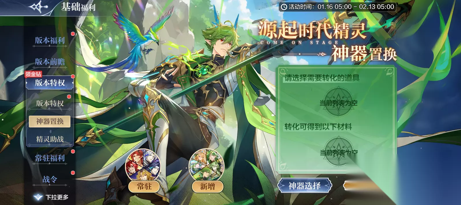 20.【时间之门】精灵上新&挑战常驻 1月16日从时间之门普通挑战移出:神曜晨曦·盖西瑞 1月23日上新:神曜灵绘·缪可 1月30日上新:神曜戮魔·余灰、原罪魔主·多洛莉丝 2月6日上新:浴血罪冠·誓祖圣龙 21.【集精灵享好礼】伙伴集结!收集精灵得神唤券、金币、享专属战斗加成 活动时间:1月16日5:00-2月13日5:00 活动内容:上线当周获得对应精灵即可领取:神唤券*10、金币*10万;同时获得限定BUFF:暴击率+35%、生命+20%加成!快来认识新的精灵伙伴、一起完成更多的冒险吧! 1月16日开启:盈沃生息·盖西瑞、繁森锐意·阿瑞斯、铠甲勇士·炎龙侠 1月23日开启:蛮荒战神·天蛮王、铠甲勇士·帝皇侠 1月30日开启:亘古年轮·永恒龙尊、颂林仙谣·卡雅 22.【集皮肤享好礼】伙伴集结!收集精灵皮肤得神器! 活动时间:1月16日5:00-2月13日5:00 活动内容:限定时间内获得皮肤,可领取对应精灵的神器2选1宝箱! 1月16日开启:永炎无烬·炎龙侠 1月23日开启:帝昭天道·帝皇侠 1月30日开启:衔枝雀·永恒神女(性转皮肤可领神器2选1宝箱+红星碎片*25) 23.【精灵排行榜】最新精灵排行榜开启 活动时间:1月16日5:00后开启 活动内容:盈沃生息·盖西瑞、繁森锐意·阿瑞斯、铠甲勇士·炎龙侠、铠甲勇士·帝皇侠(1.23开启)、蛮荒战神·天蛮王(1.23开启)、亘古年轮·永恒龙尊(1.30开启)、颂林仙谣·卡雅(1.30开启)加入精灵排行榜、上榜即可获得精灵专属称号、头像及头像框! 24.【至尊召唤】至尊卡池上新! 活动时间:1月16日5:00-2月13日5:00 活动内容:盈沃生息·盖西瑞源起材料加入至尊召唤! ● 至尊券获取: 每月福利签到:至尊券*10 至尊商店钻石购买:至尊券*52 ● 限时至尊券获取: 1、狂欢登录礼:限时至尊券*12 2、盈沃生息·盖西瑞挑战:限时至尊券*20 3、王牌战队(1.30开启):限时至尊券*20 3、每日任务达成120活跃度:限时至尊券*28 4、每周任务达成250活跃度:限时至尊券*20