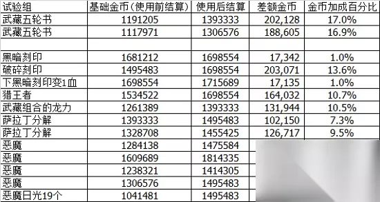 50级铠甲15日光结算1.5M金币以上算是合格。 一些可能遗漏的影响金币数量的细节: 因为神性结晶享受锻造笔记加成,所以最后再吃。 留墓碑可以获得50多点白字攻击,且触发十字军的第五段加攻,因此记得留。 第一次大地后,选择不进洞可加快一定速度。 有人说重生一次后点剑圣就行了,实际上重生只是清掉了偷火神雕像被debuff的降低25%攻击,离最大攻击还差了一截。那个debuff用神恩或者痊愈就能消,且不消除也不影响剑圣和结算。 目前阵容核心帝释天、十字军、信长这三个动不了,第四个冈布奥大家有几个选择,我谈一下刷过5局以上的阵容的评价: 圣灵,其优点在于速度快,技能掀桌全覆盖,操作简单不用担心没地震。熟练后可以40分钟刷1.3M。缺点上限低,药水绑定圣者的凝视,圣灵难以获得。 萨拉丁,探索点宽裕,但是实际实在是没啥用,只能加10w多一点金币。 寄生龙宝宝,适合每天刷到工资就停的人。 寄生恶魔宝宝,金币与武藏相当大概多20M,但是多一整个恶魔系导致探索点紧张。 测试采用的方法:以武藏为例,同一局火神招满怪后压血暂离,利用黑科技,点剑圣+三本武器大师之证后结算看金币,再退游戏回来点剑圣+五轮书+三本证结算得到第二个金币数,两者差值就是一本五轮书在本局中贡献的金币。(黑科技没法看分享金币) 测试的样本比较少,可能有较大误差,仅供参考。