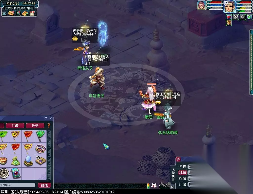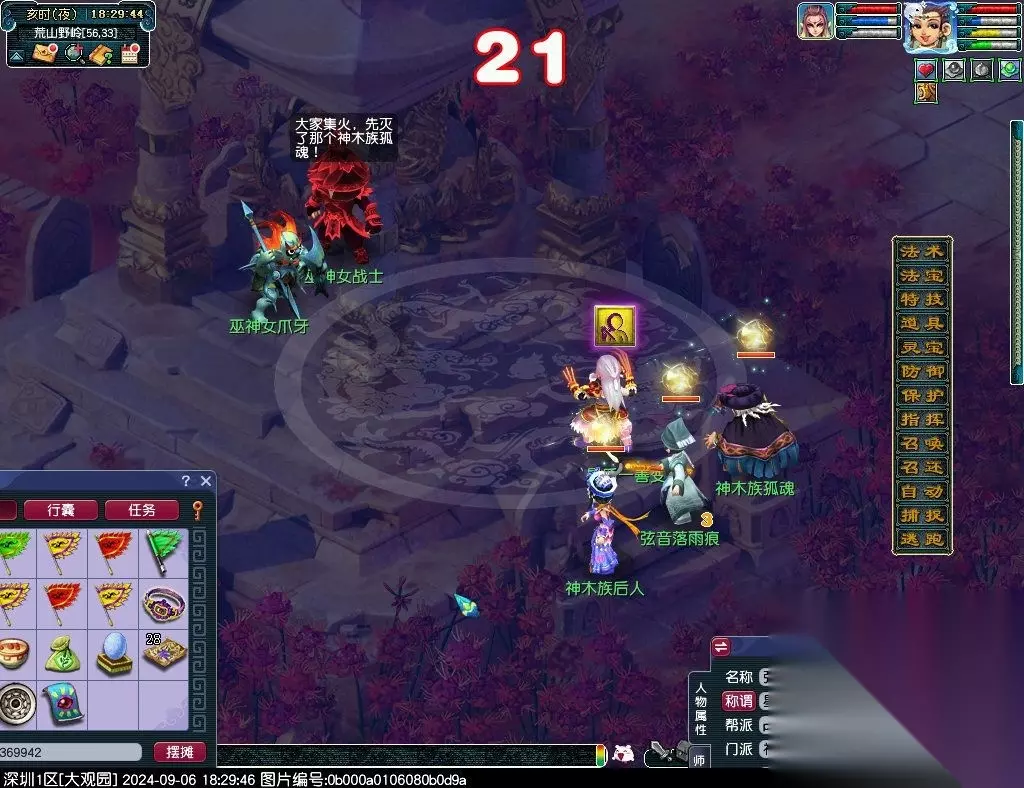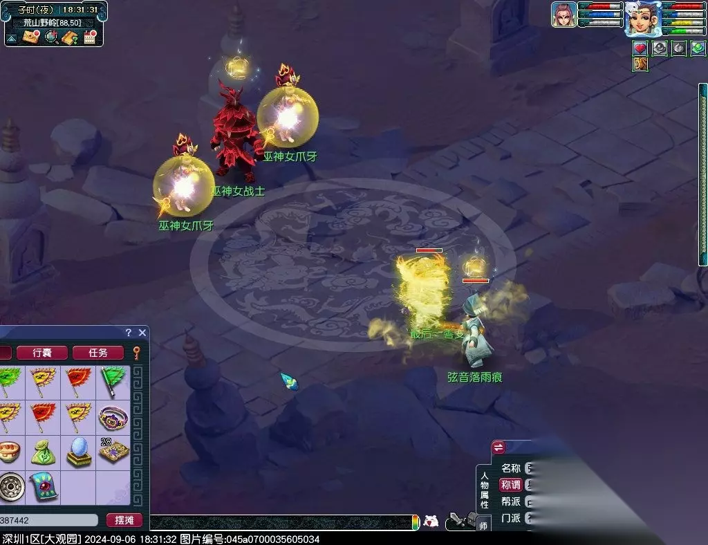 13、击败巫神女战士(88,50)[战斗,难度不大,可单人挑战];主怪门派神木林,爪牙门派狮驼岭,会使用象形;
