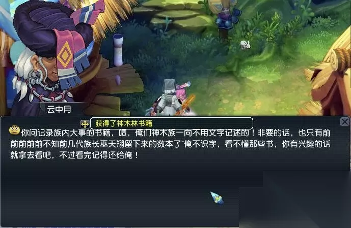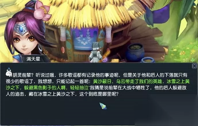 3、与师傅对话得知神木族有一位法术高超的前辈-胡灵,通过歌谣、书籍、雕刻来寻找线索——找到满天星(37,134)、木像雕刻(20,34)、云中月(18,103);