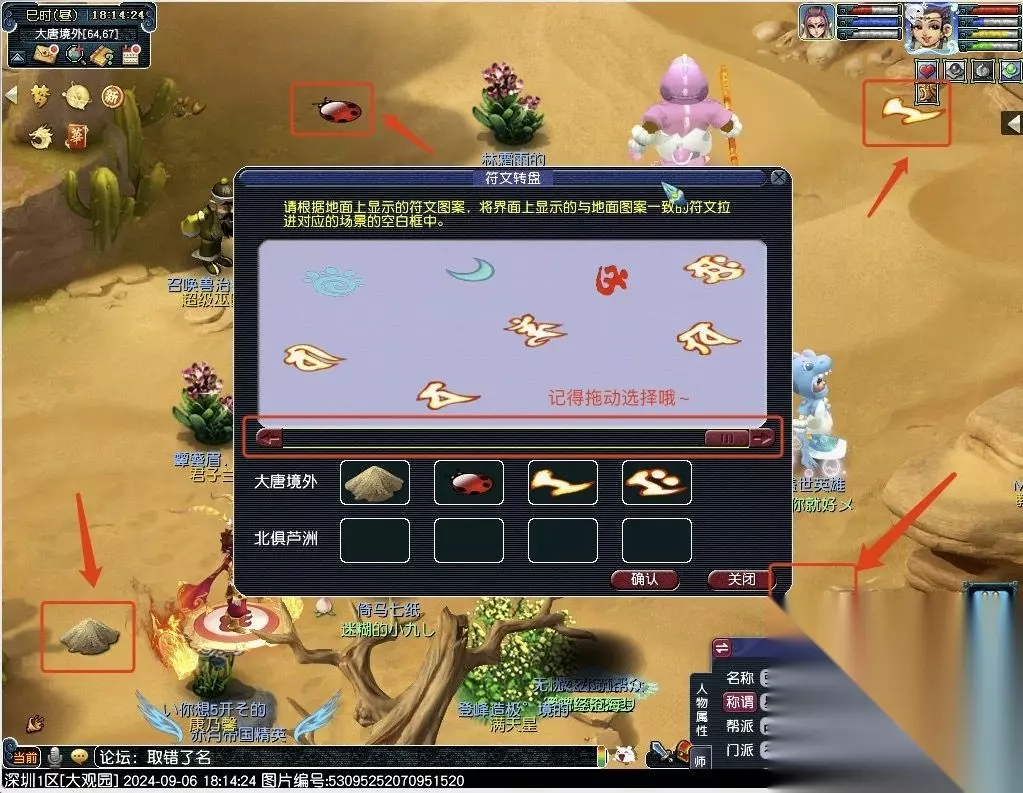 9、使用符文转盘,找到对应符文图案拖入咒语框内——范围有点大,需要走动一下寻找,符文图案处可拖动查看全部图案;[小游戏]