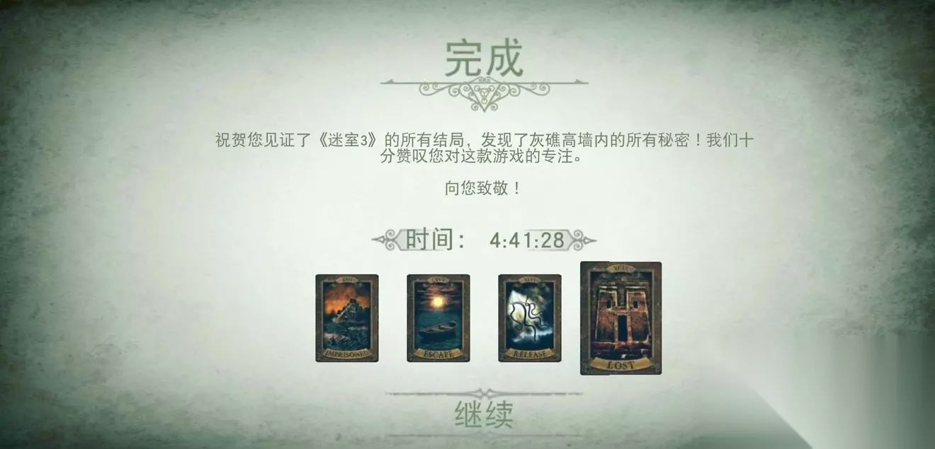 迷室一系列游戏都是非常好玩的,这是大家公认的。《迷室3》是迷室系列中的第三部,也是最难的一部,而且它有四个结局,每一种结局都是主角的一个命运。提示只会出现在第一个结局,其余三个结局是没有提示的,所以其余三个结局是需要大家动点脑子了。话不多说我们进入主题 在进入最终场景前,需要把所有道具收集齐,其实在你收集道具的时候你就能在占卜机那里看到这四种结局。工匠的钥匙和螺丝刀这两个不用说,你肯定会有。神秘的神奇x2一个底部是正六边形(左)另一个底部是直角梯形(右)。这些就是所有的东西。 第一个结局---被困 在解完最后的谜团时,会升起两个台子和出现一个门,台子不去理它,直接去那个门,那个门通往游戏最开始的火车厢房,然后火车过了一个隧道来到了另一个世界,此时镜头拉远,你会发现主角被关进了一开始突然出现的木盒里,而拿着这个木盒的人正是你透过门缝看到的那个光头。此时主角则在那个无限循环的世界。 第二个结局---逃脱 解完最终谜题会升起来两个台子,此时去完成左边的那个谜题,随着一道光的射出原本进入火车的门变成了一个木门,这个木门通往一个船屋,主角乘着小船离开了这座岛,而岛上的建筑全部被树根所毁,这时主角发现前方不远处有一座小岛。这可能是真正的逃脱,也可能是另一个陷阱。不过小编到是希望这是另一个陷阱,这样续集与前作有了联系,这会有一种归属感。 第三个结局---释放 同样是解完最终谜题的那两个台子,这次只完成右边的谜题,这次依然是变成木门,主角进去后依然会乘着小船离开,不一样的是,岛上的建筑会被巨大的黑色触手摧毁,同时天上也伸出了很多的黑色触手,在往上看就是被云彩遮住了,这个怪物深不可测,它现在被释放出来了,那么接下来的剧情会怎么走呢? 第四个结局---迷失 还是那两个台子,这次两个都解,左边那个正常解,右边的那个解之前要做一件事,对我们的螺丝刀派上用场了。将镜头划到后面把那个螺丝拧掉,把挡板打开。细心点会发现如果不完成这项工作,在解完谜题后它还会降下去,完成这项工作在进行解密则不会降下去。这个结局才是完成了所有谜题,手上道具一个不剩。然后解完迷题后,门会变成黑色的液体,还向外冒着黑气,当你走进去,你会发现你来到了另一个星球,在你眼前的是一座巨大的金字塔类似物。 下部预测 小编认为第四个结局最有可能是下一作的铺垫,想想,外星球、金字塔类似物、虚空,特别是金字塔类似物,在第三部中,你曾两次通过仪器探索过一个古老的建筑,而建筑作用的风格与金字塔特别相像,下一步很可能就是探秘金字塔找到虚空回到地球。 奈何第四部已经发布了《迷室:往逝》,与第三部没有任何关系,是一个玩具屋,里面藏着虚空。但是工程师爱德华的妻子阿尔盖比却没有找到,迷室3的主角也正是阿尔盖比,第四部很有可能是第三部的前传。 结语 希望后作中也能出现与现实世界有关的东西,比如第三部的那个钟,也就是上图,与你手机上的时间是相同的。这一点做的小编觉得非常棒。