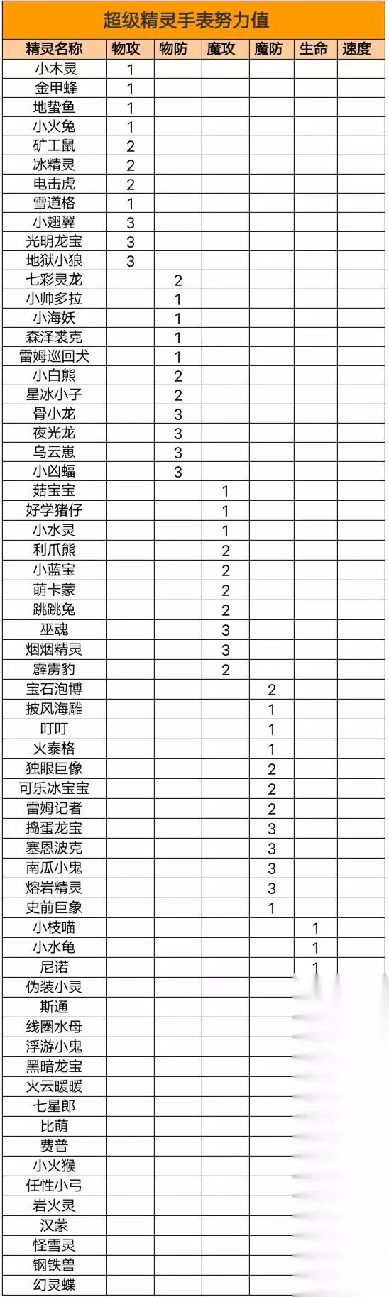 超级精灵手表全精灵努力值一览: