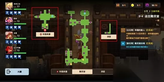 【返回难民营】 副本类型:主线 进图消耗:15 怪物等级:66 属性推荐:光 【任务】 帝国的敌人:守护者揭发了大臣的恶性,是帝国恢复和平,虽然最后不知道守护者去哪了。 难民竞技场:你已成为难民竞技场的霸主。 【全收集地图】