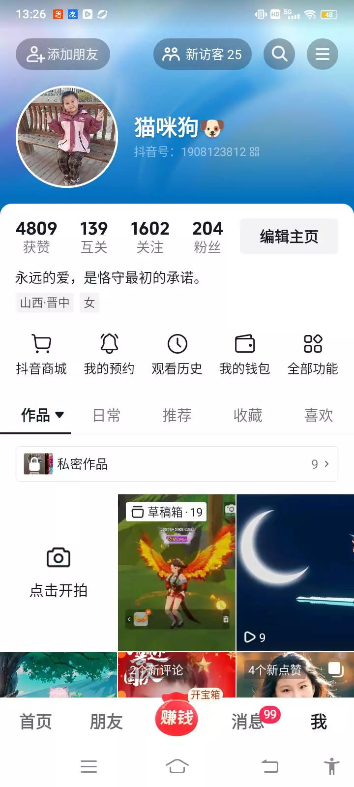 我的主页普普通通,头像是本人自拍的,粉丝204个,获赞个数4809,关注1602个。
