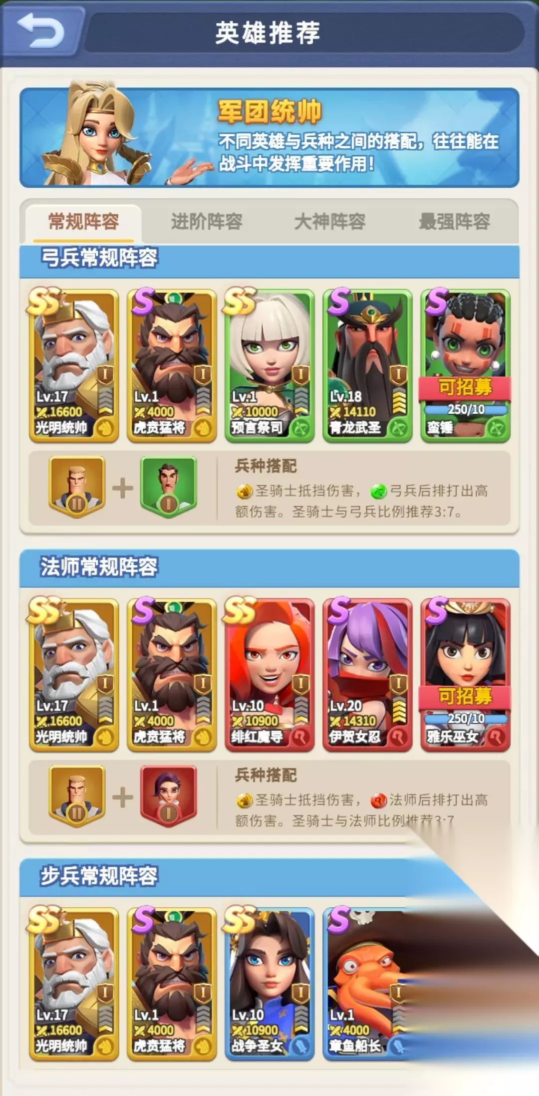 当然想要打军团战的话,英雄角色本身的属性就不是重点了,其军团技能才是,同时兵种也是一个重点,如果搭配上不好把握,其实游戏内都为各位准备好了相应的推荐阵容,小伙伴们可以直接套用,或者也可以在其基础上自行调整哦。