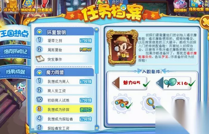 洛克王国我想成为侦探怎么完成 侦探入职条件:魅力45、咕噜茶16、望远镜、放大镜和凸透镜。