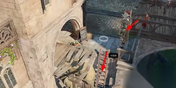 2、根据箭头指引,先从楼梯上下去,然后使用悬浮术跳到对面的岩壁上。